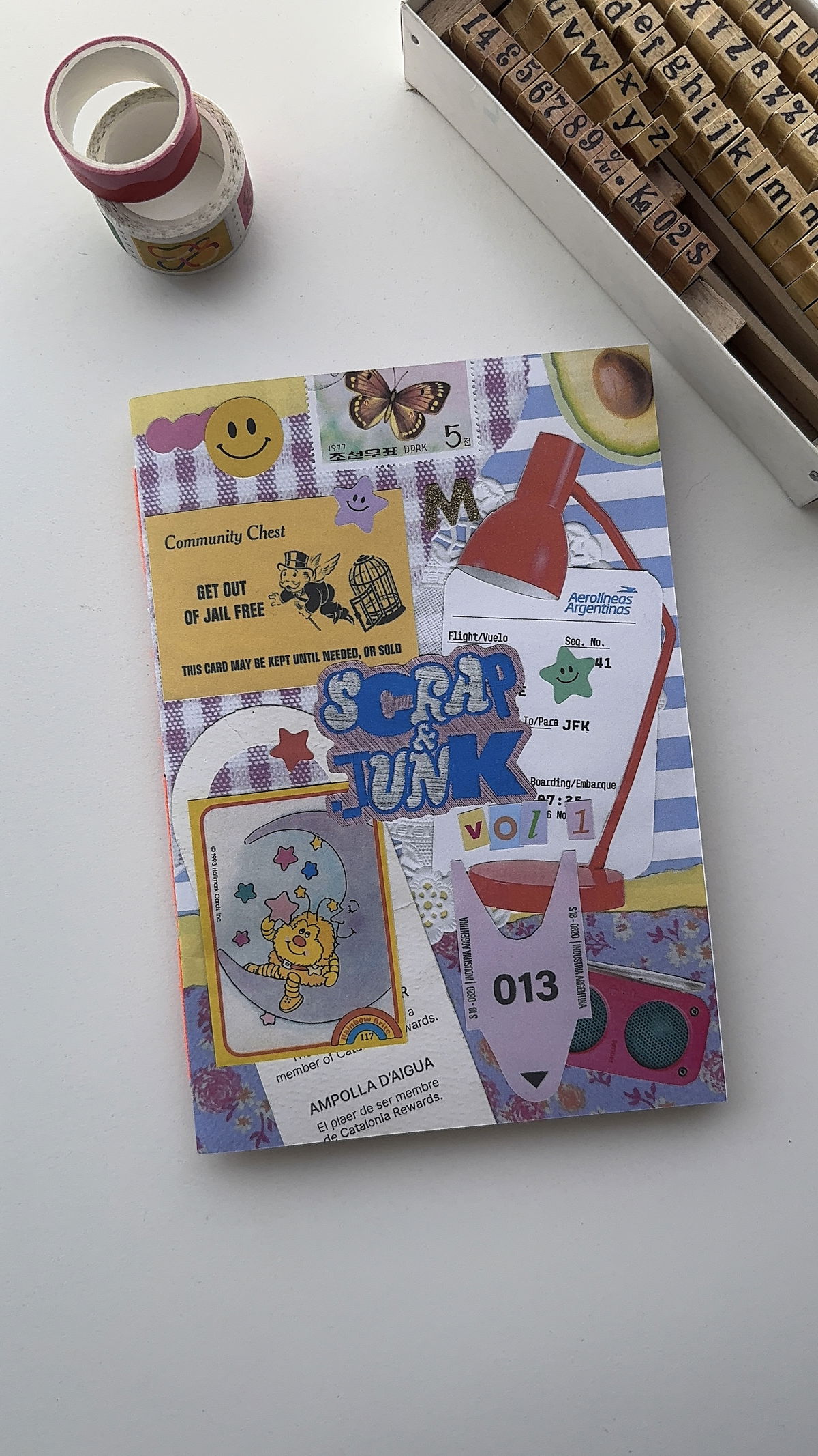 En Scrap & Junk Vol.1 vas a encontrar definiciones de que es el scrapbook, junk journal, art journal y travel journal, una técnica y tips, una idea de páginas, figuras recortables, fondos, postales para que hagas collage y actividades. El zine está cosido a mano.